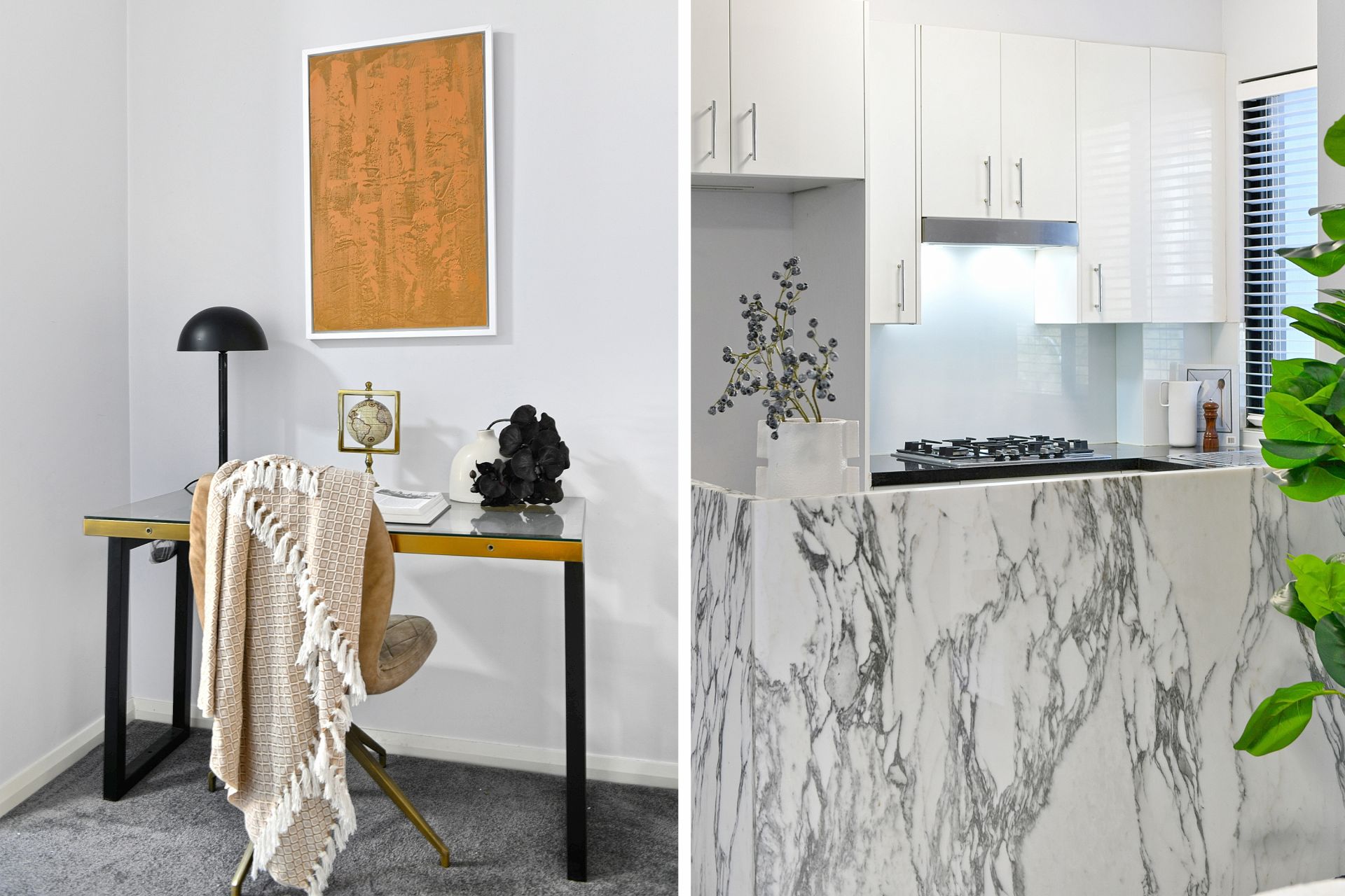 - Food preparation is a pleasure in the modern kitchen. Features include a gas cooktop, dishwasher and breakfast bar. Marble effect decorative granite divides the kitchen from the living space