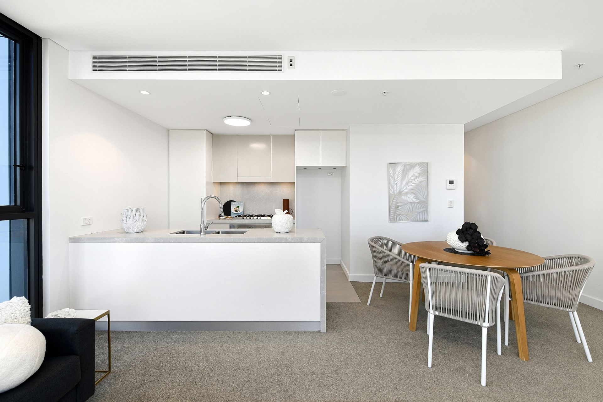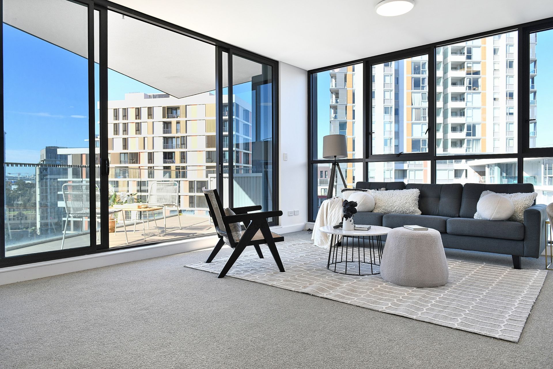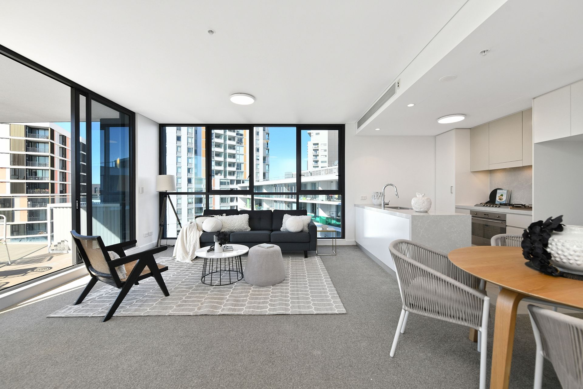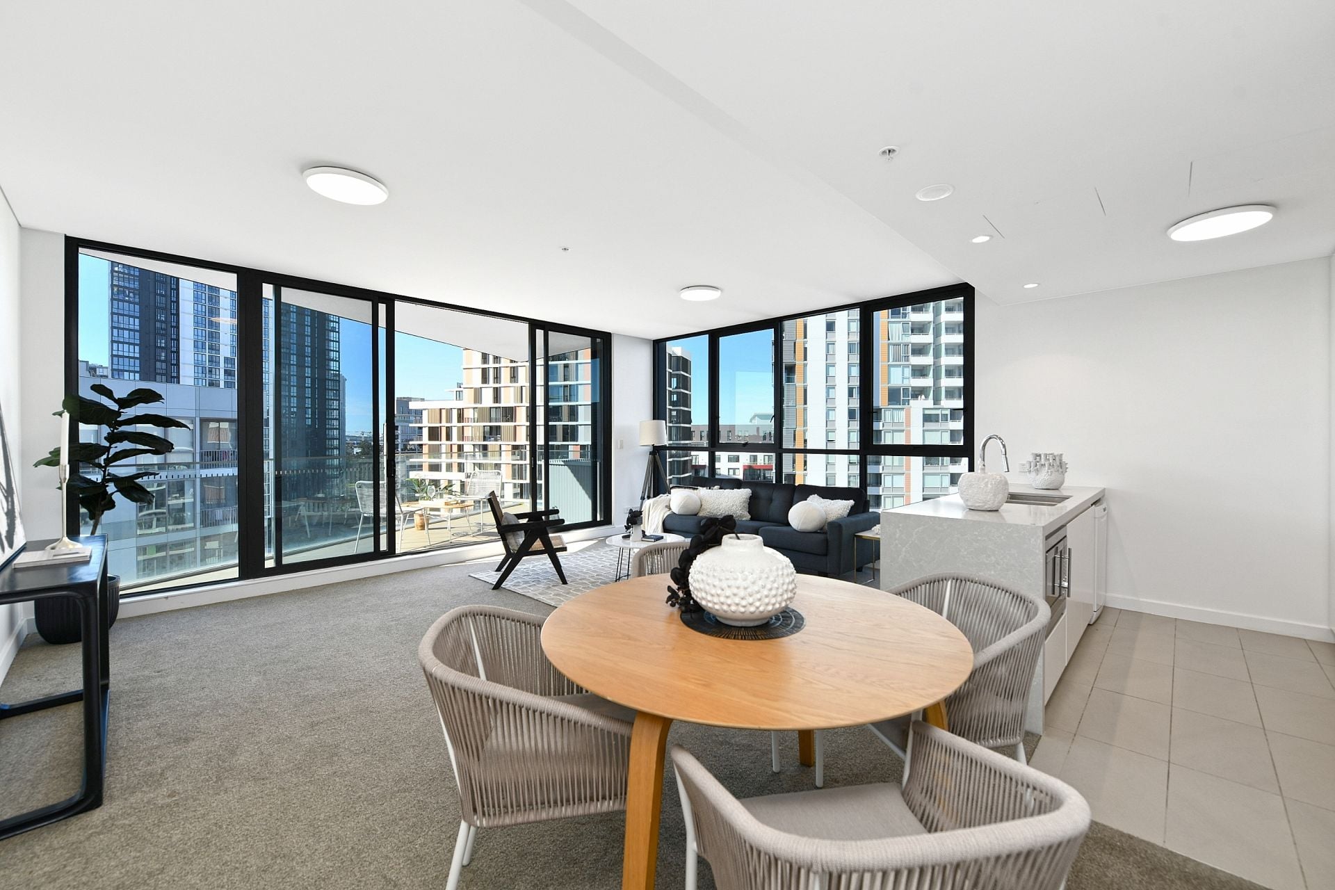 - Floor-to-ceiling glass surrounds the large living and dining area and enhances the apartment's light-filled, welcoming atmosphere.