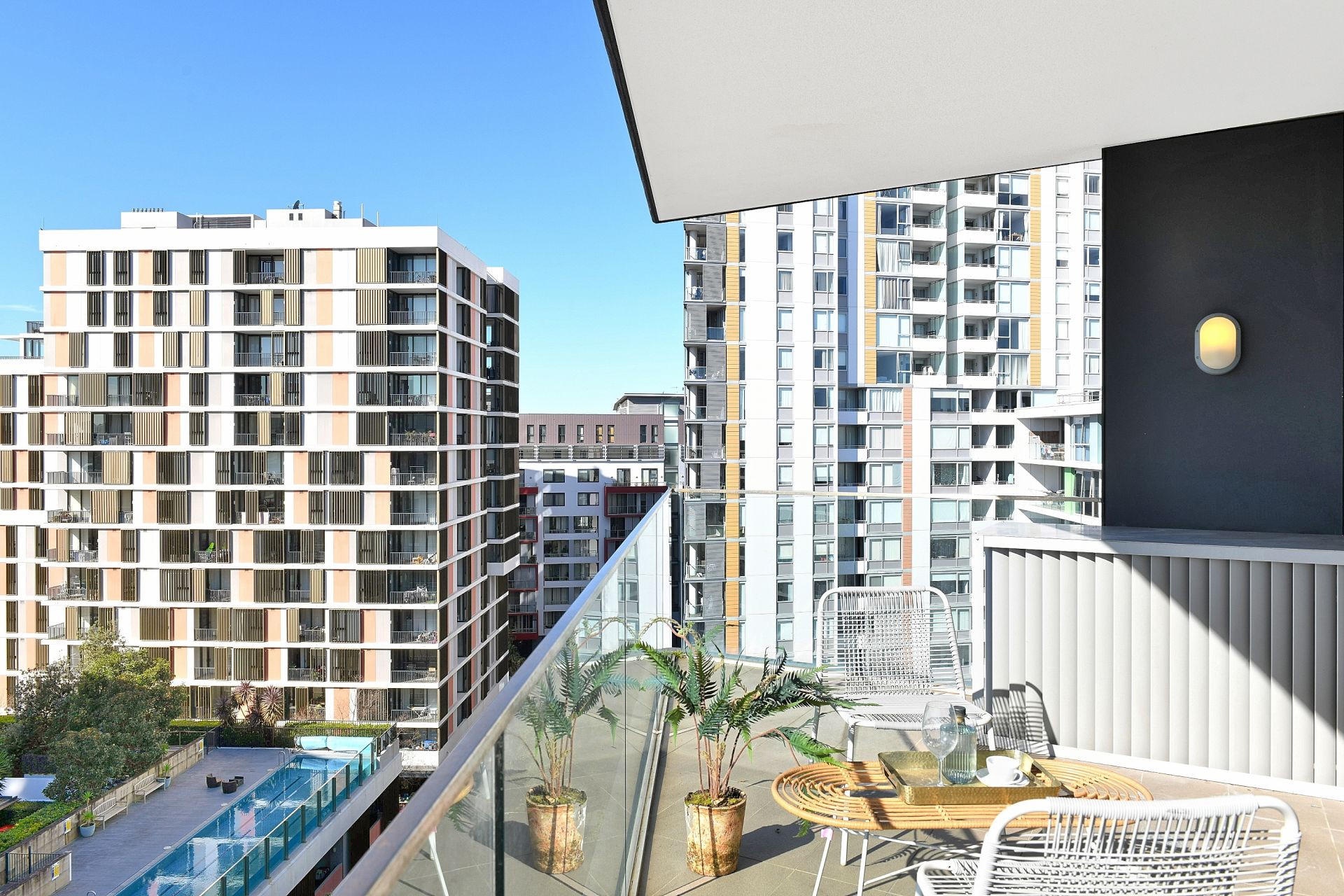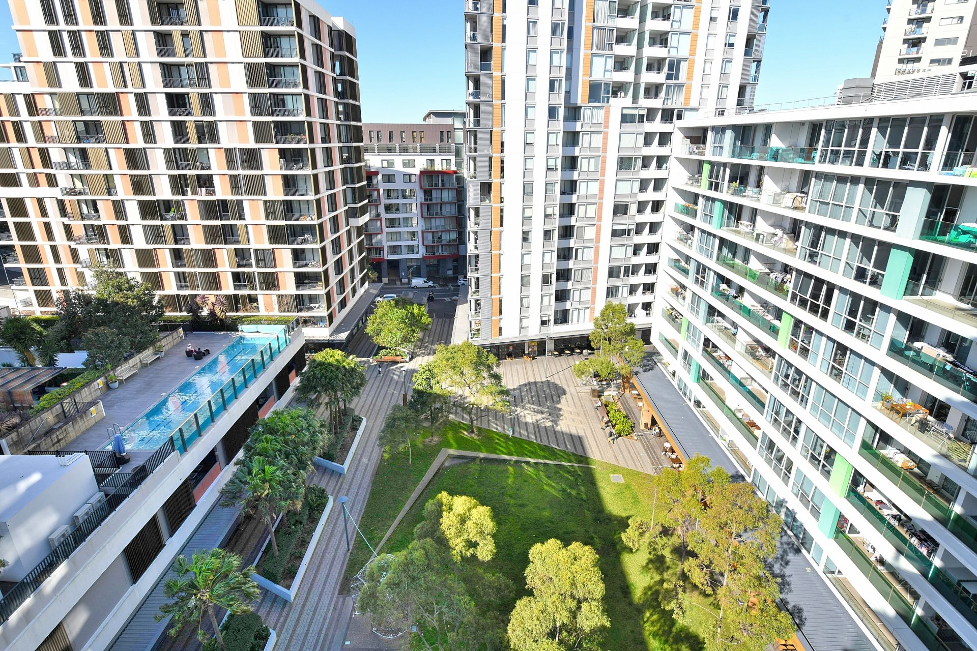 - An extra wide north facing balcony offers a vibrant outlook over the Village Square, with its bustling cafes and eateries, and a captivating view of the rooftop pool. A lively and attractive feature