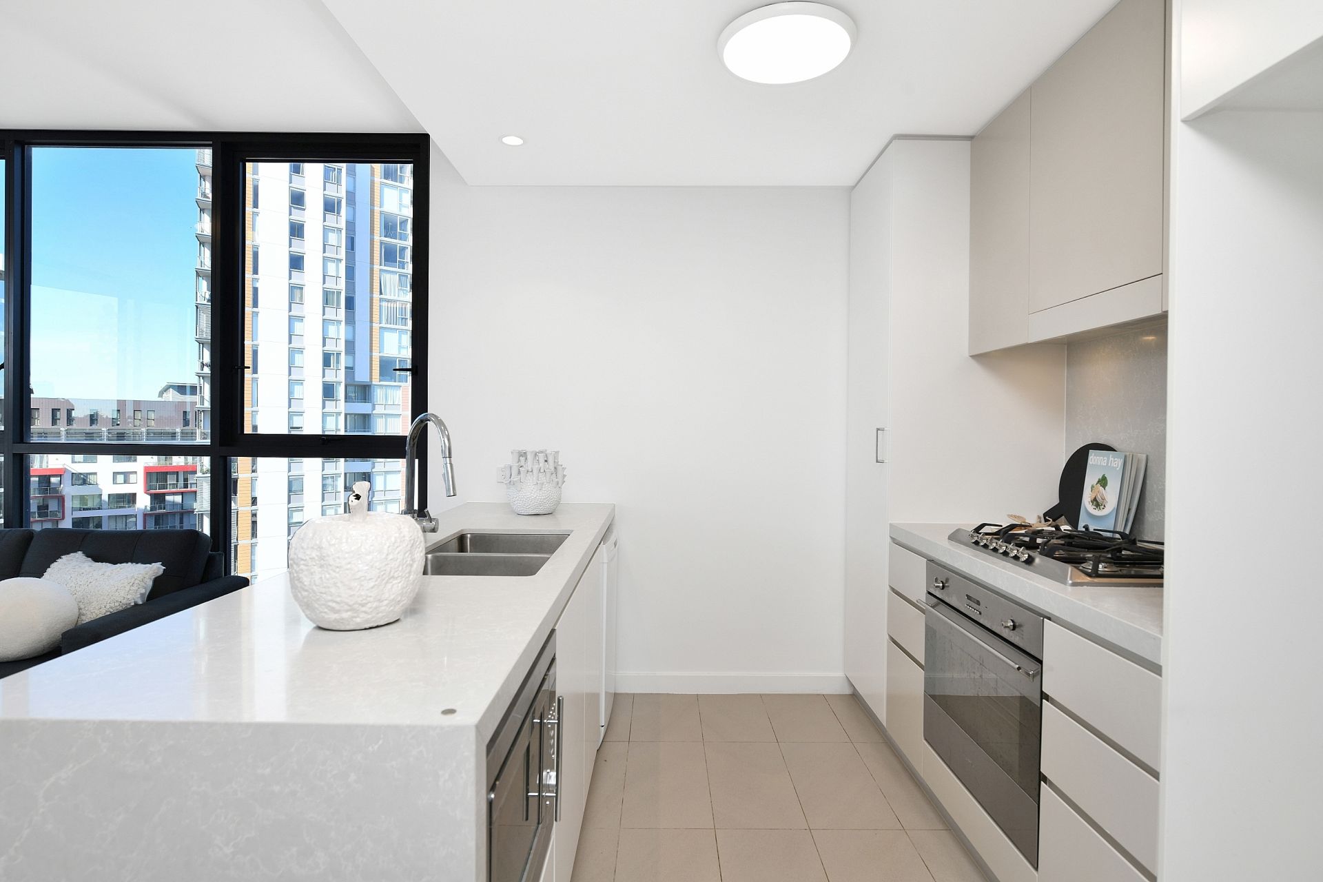 - The contemporary kitchen features stone benchtops, quality stainless steel appliances, gas cooktop, ample preparation space and storage