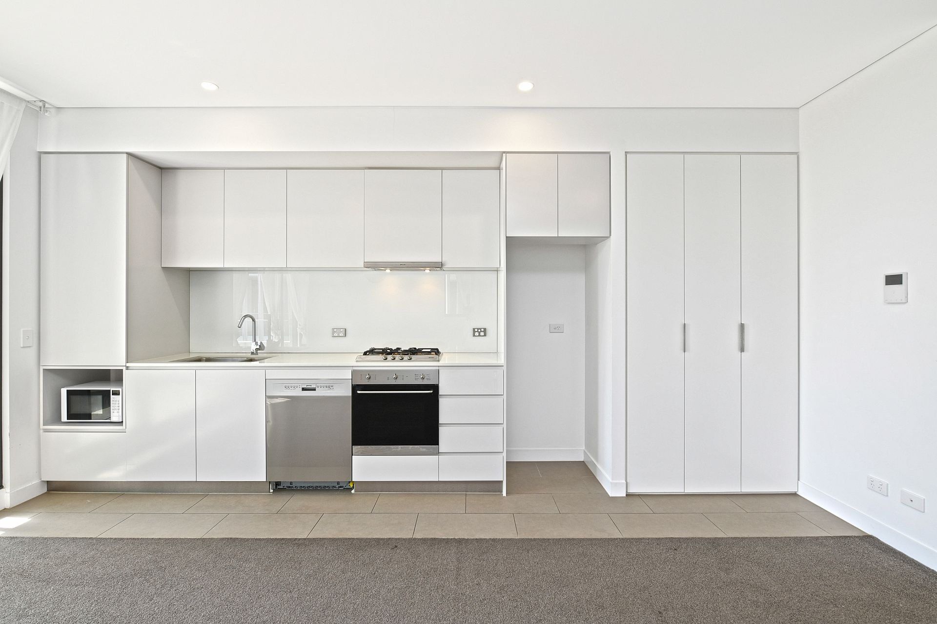- Sleek galley-style kitchen with stone benchtops, gas cooking, stainless steel Smeg appliances and dishwasher