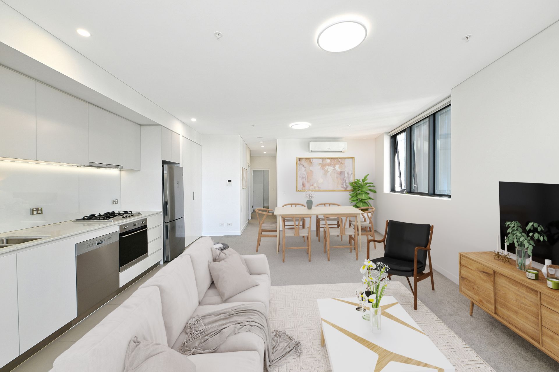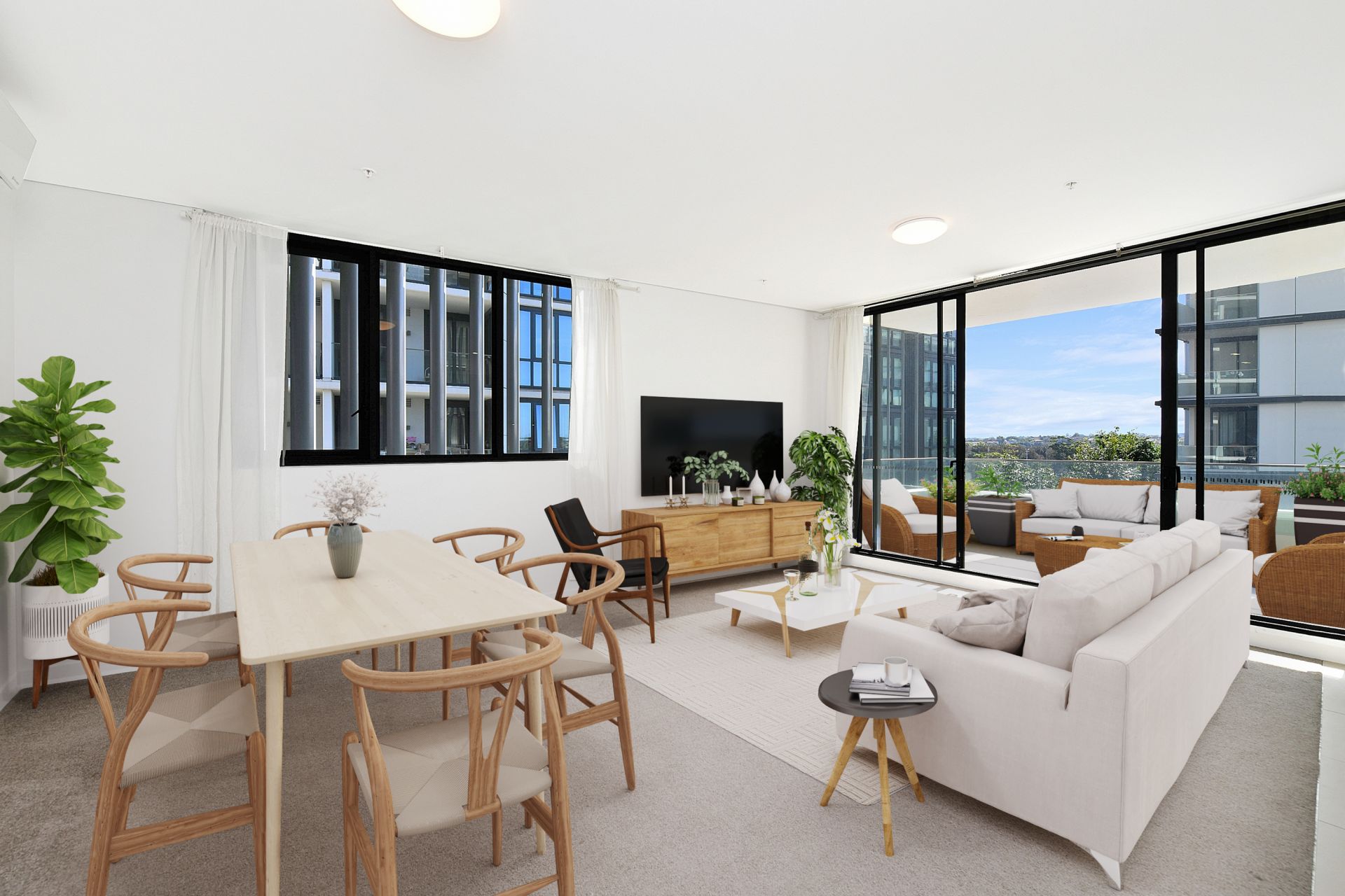 - Light-filled open plan living and dining area with floor-to-ceiling windows showcasing urban views